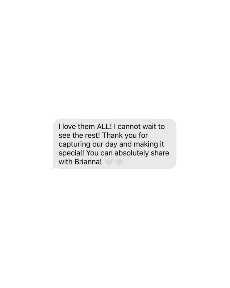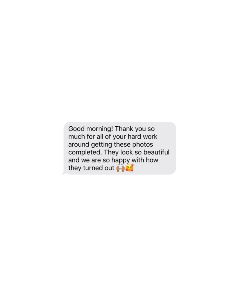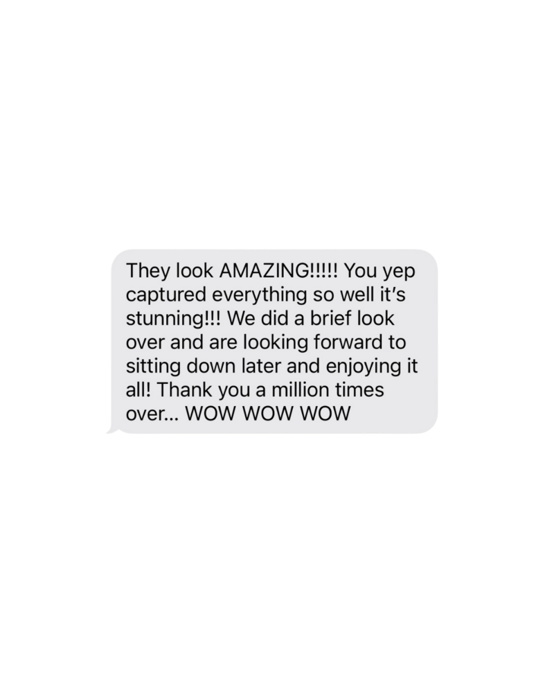 Absolutely! We do edit our images, but never to the point where you look overly retouched or unnatural. Our focus is on preserving your unique essence and staying true to the genuine, emotive style we’re known for, even if that means embracing a few perfectly imperfect details. Light skin smoothing and blemish removal are included, and we’re always happy to accommodate any specific editing requests you may have.