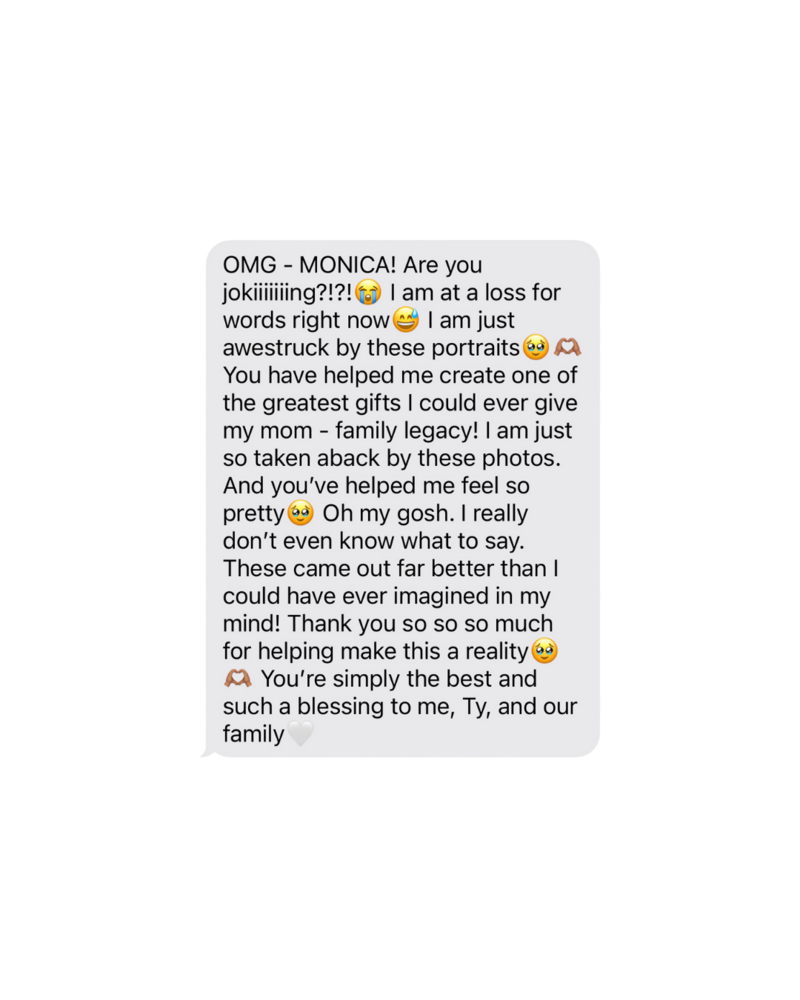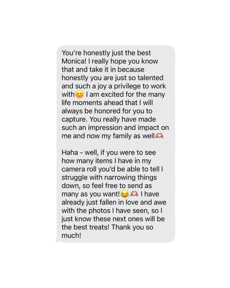 Within just a few days, you’ll receive a sneak peek of your session in your inbox. Your full gallery will follow in 2–3 weeks. Your story deserves to live on beyond the screen and I'm here to help you on that journey. We'll work together on creating timeless albums and heirloom prints that will turn your images into meaningful keepsakes you’ll treasure forever. Our connection doesn’t end here. It’s my honor to be part of your story, and I hope to continue capturing your life’s beautiful seasons for years to come. This is just a beginning!