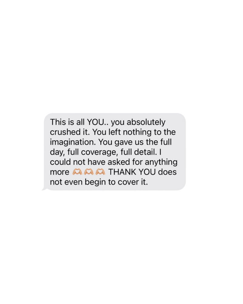 Every story starts with a simple hello. Once you reach out, we’ll set up a time to talk and truly connect. I want to hear about you, your values, and your vision for the day. We’ll explore whether we’re the right fit, and if it feels aligned, I’ll send over a custom proposal to make it official. From there, your legacy begins to take shape.